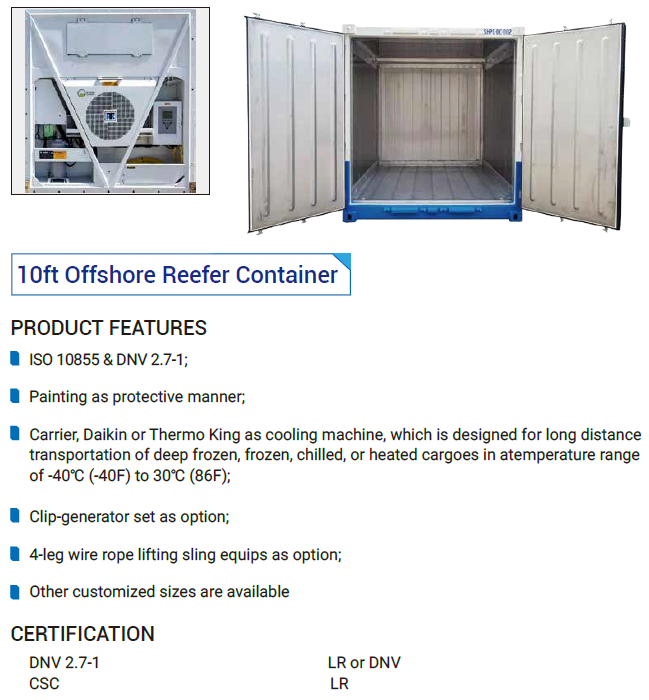 A offshore refrigerated container is a kind of container specially used for maritime transportation and storage of temperature-sensitive goods, equipped with a refrigeration system and thermal insulation structure, which can provide a stable low temperature environment for goods during sea transportation and ensure the quality of goods. It is mainly used for the transportation of perishable goods such as fresh food, medicines, flowers, etc., and is also used for the transportation of materials with temperature requirements in the oil and gas industry.